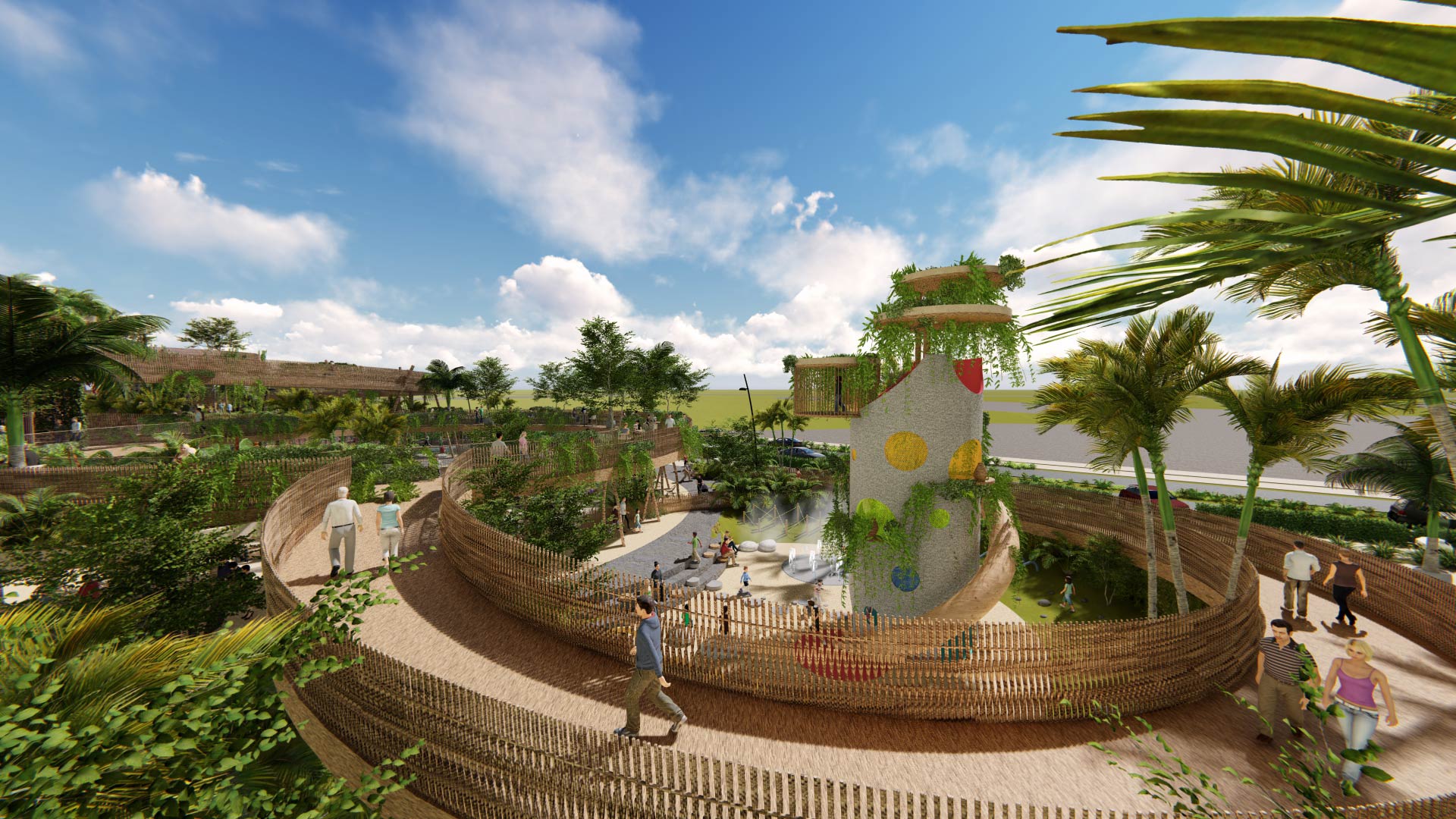 Inspired by the native nature of “the cenotes” in Mayan Mexico, a significant ramp acts as a landmark and creates 3 different atmospheres that evoke the sensations of cenotes: peace, harmony, and adventure, creating a place to be used both day and night. The plot was divided into a Welcome Area inspired by a pond that connects spaces and gathers people, a Family Area conveying an active and fun experience for the entire family, centred around an iconic playful tower for kids, and an Active Area, which is the most intense and spectacular part of the intervention, made up of 4 active isles in a completely natural environment.